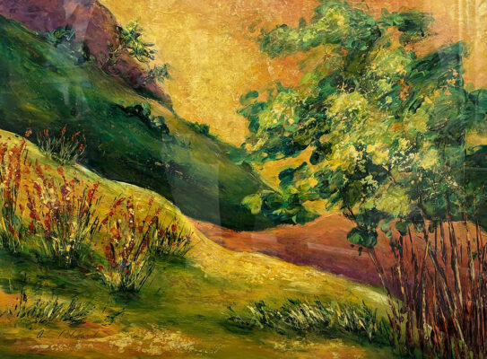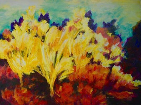 Ann Pollard’s paintings exude an uplifting, joyful spirit. Working in either an abstract or impressionist style in acrylic and mixed media, Ann Pollard paints with her heart intuition and instinct, not bothering with conventionality and often abandoning literal representation. She creates pictorial harmony while ever stressing the importance of expression. Bold color, pattern, and texture are paramount in Pollard’s work, creating lush layers of washes, glazes, and impastos which unite to the spirit of the whole. She likes the combination of the many effects throughout the depths of layers which create a varied and interesting surface area. There is never a preconceived plan; color serves the expression of each experience. The relationship of all the colors and textures result in a living harmony.