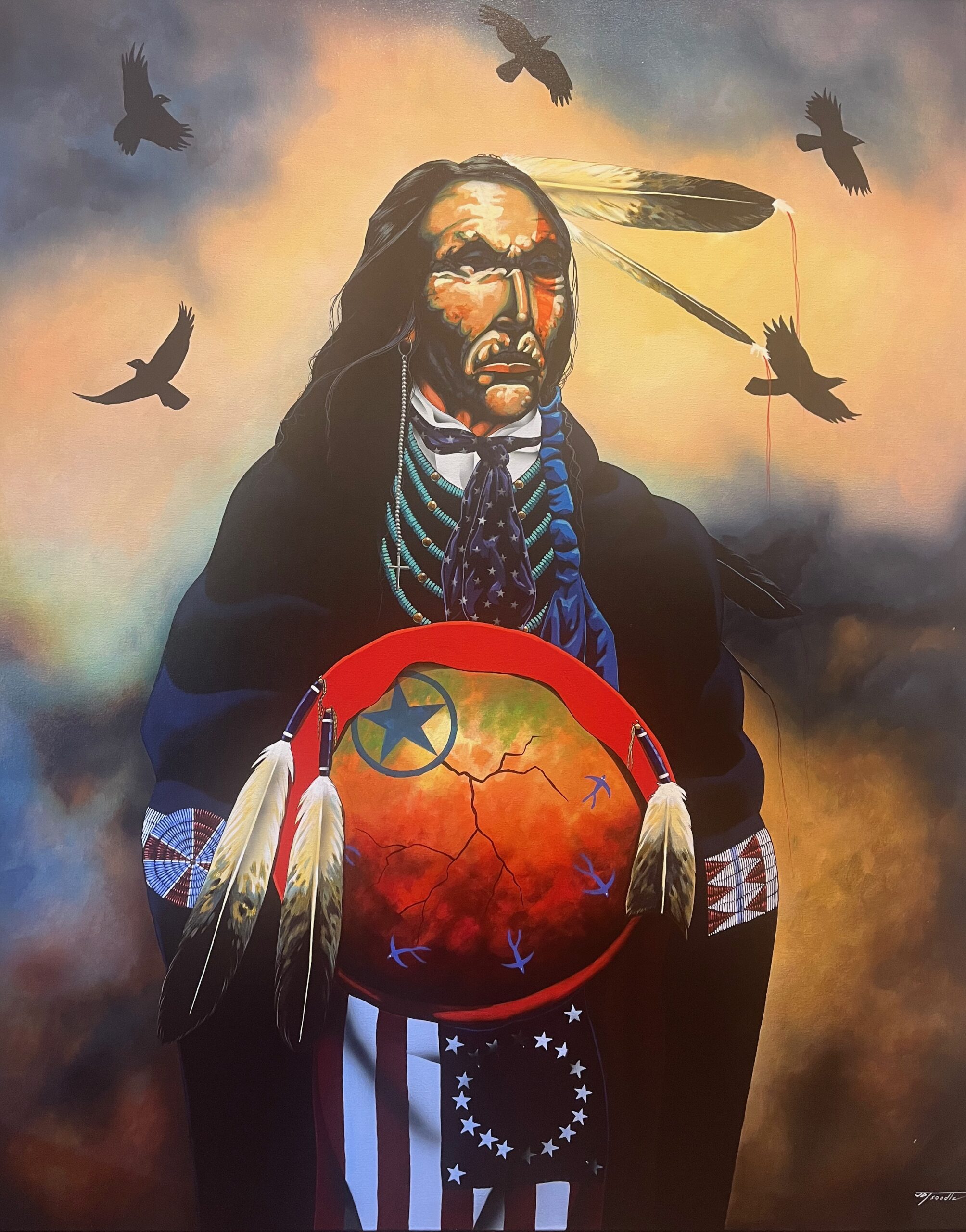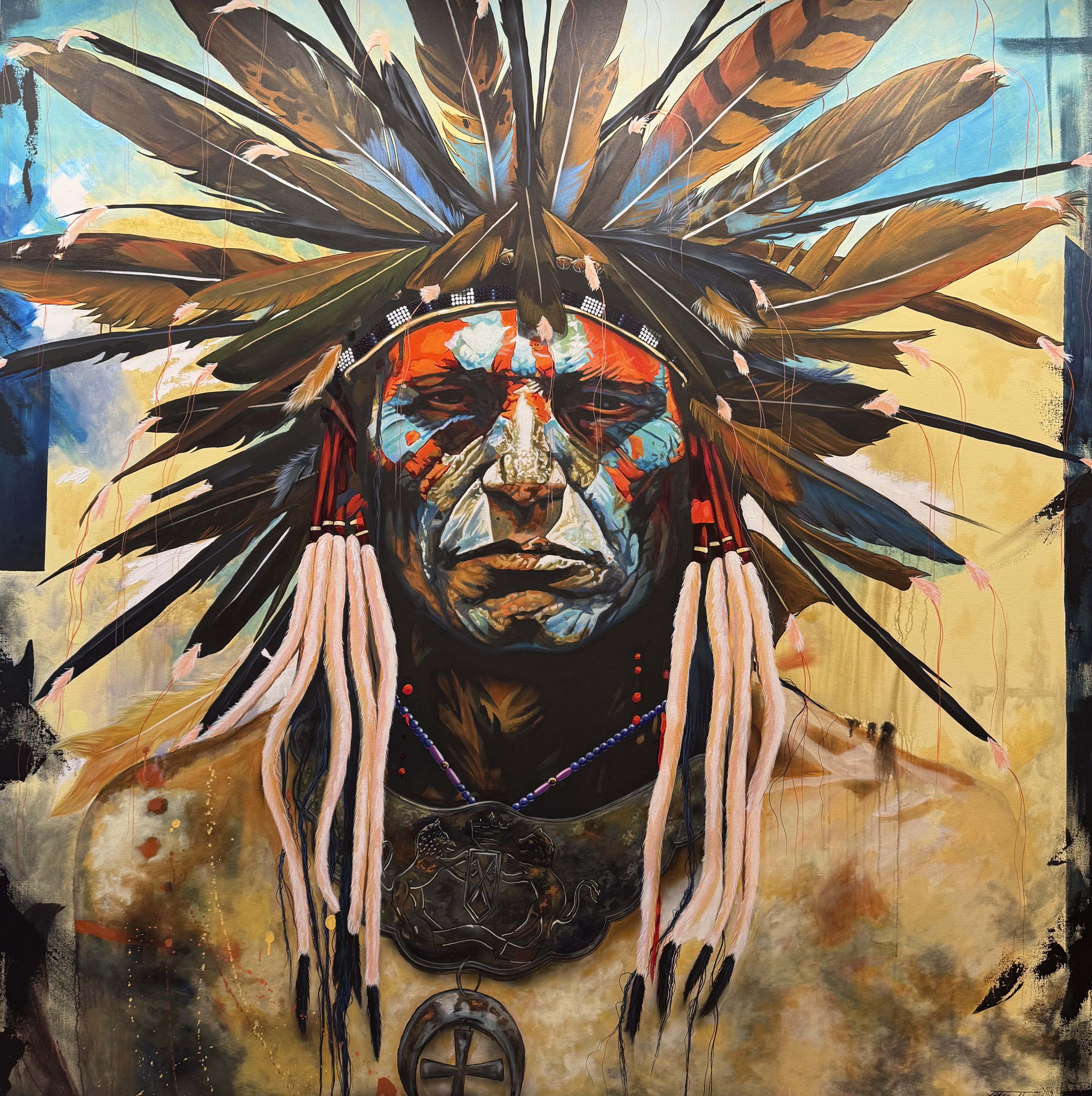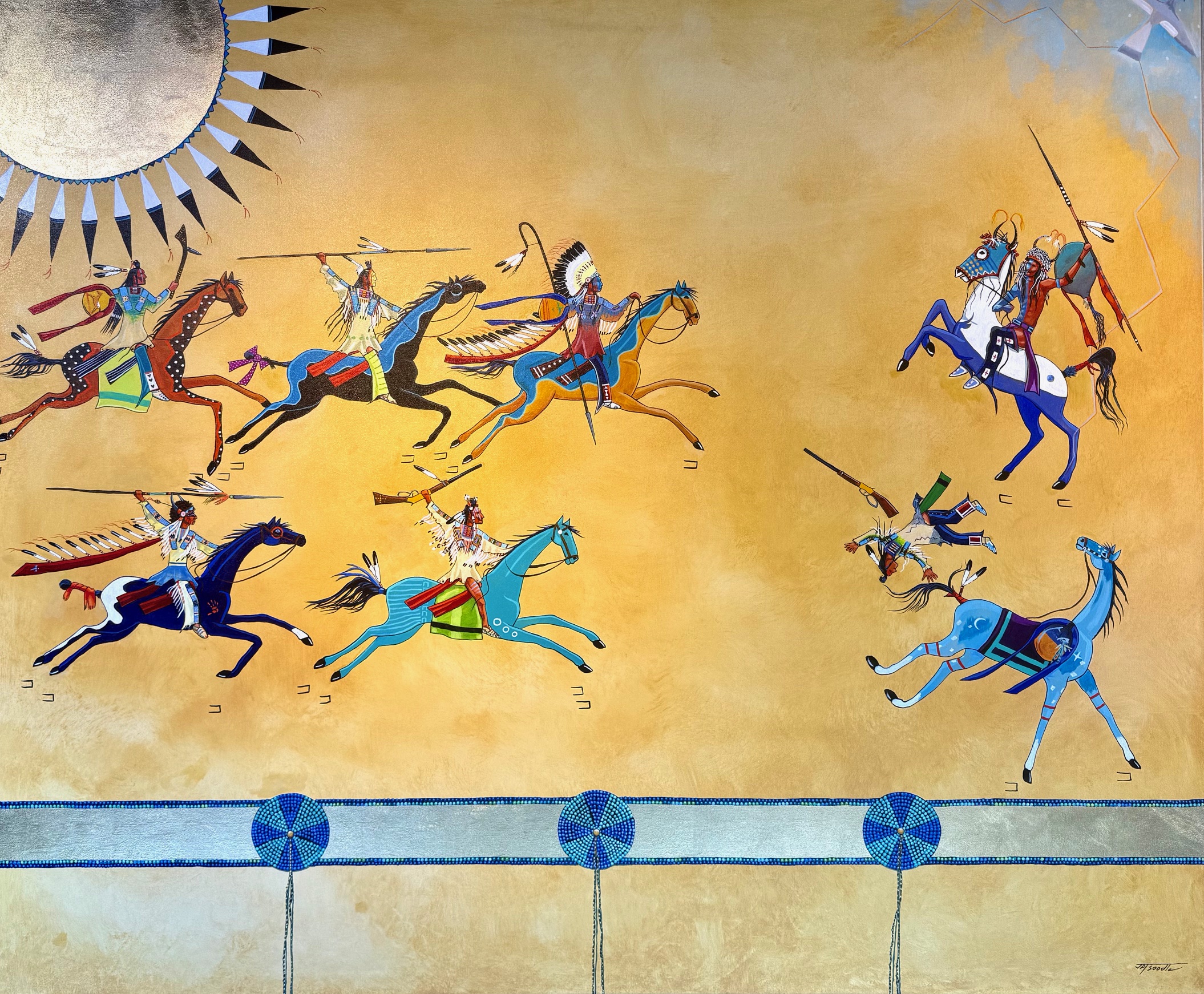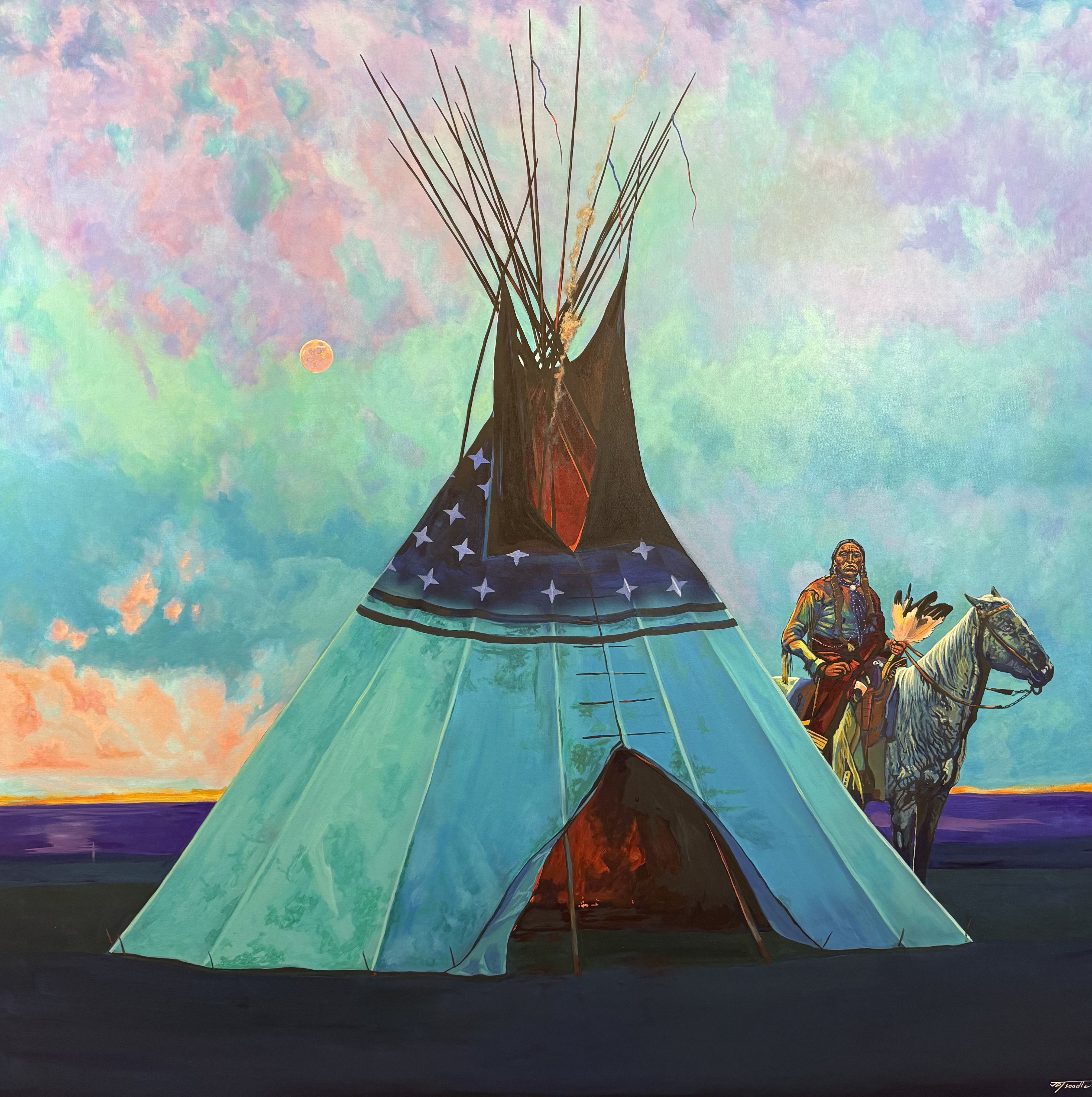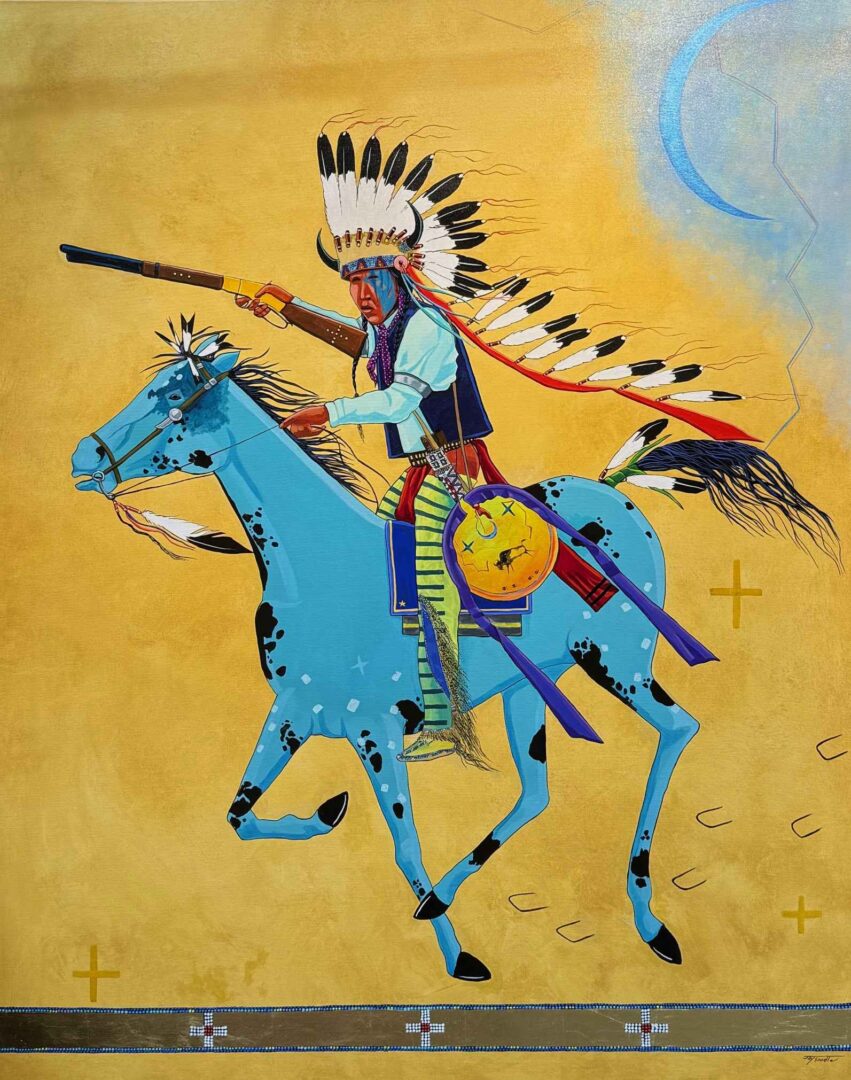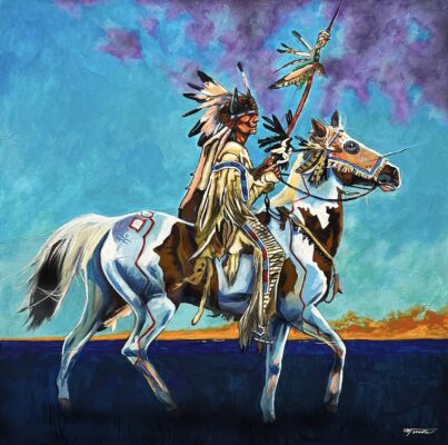 James Tsoodle believes that in any pursuit, one should strive for a sense of perfection. As a child, James experimented with various mediums, including pen and ink drawings, pencil, watercolor, and pastels. Today, he primarily works with acrylic on canvas. His artistic focus is on Native American Warriors from the Northern and Southern Plains. James believes that deep knowledge of the subject matter is essential for an artist to truly capture the essence of an image. He hopes that his dedication allows others to feel passion and power not only in the imagery but also in the pigment, flow, and composition of each painting.