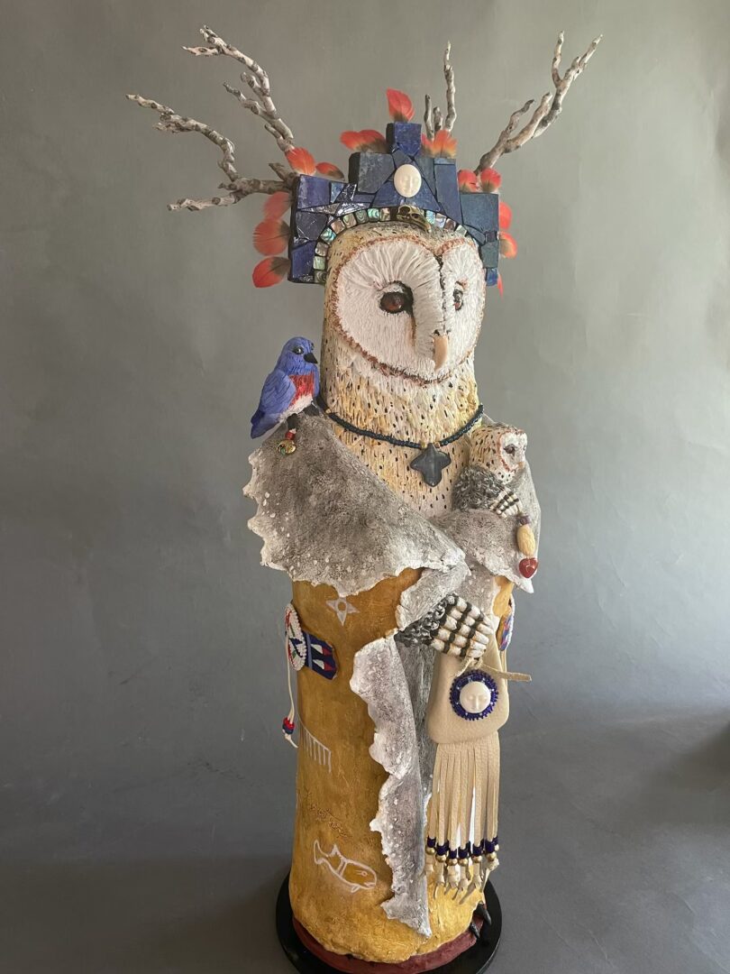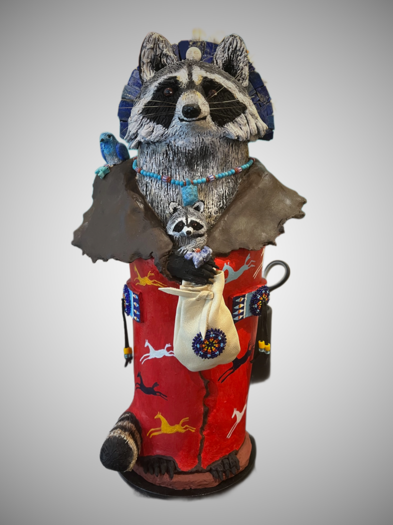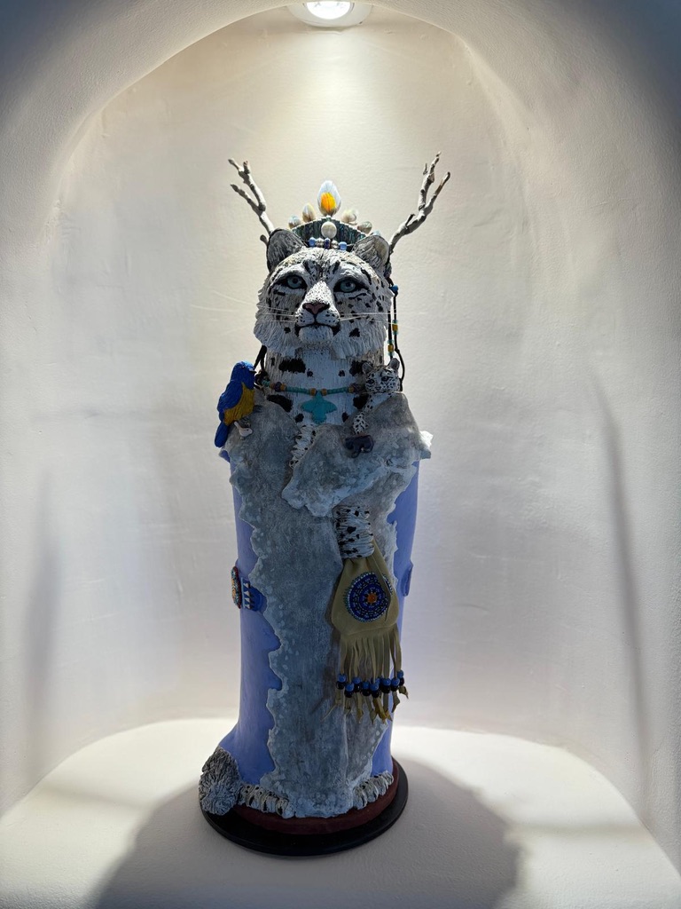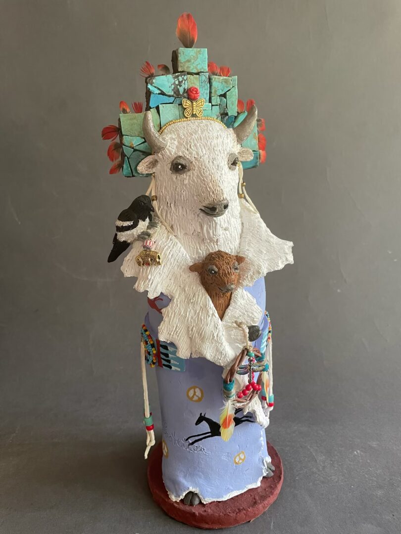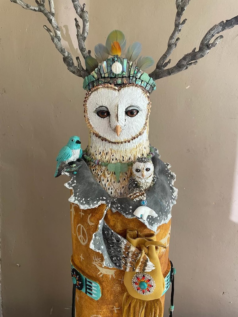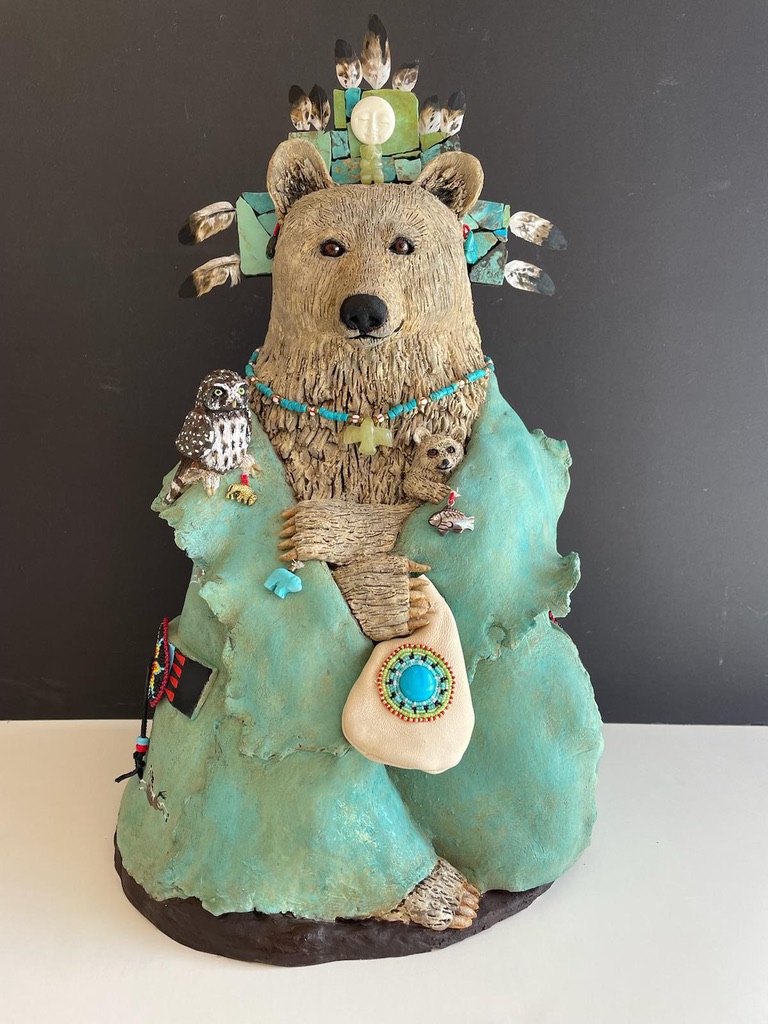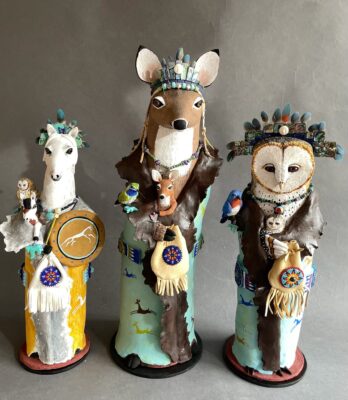 Each sculpture, inspired by dreams and folklore, is created in clay, fired, and then painted with oil paints. Each sculpture is also uniquely embellished with bead work, gemstones, and feathers from her macaws. Lostetter’s distinctive style of mythic animal sculpture is influenced by folk tales from ancient cultures and her respect for wild animals, their spiritual integrity, and their value to our world. Each of her sculptures carries a theme of nurturing; loving care for the young and for all life on this planet weaves through each detail of her sculptures.