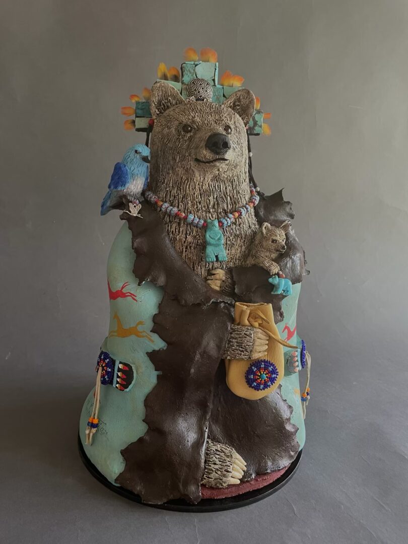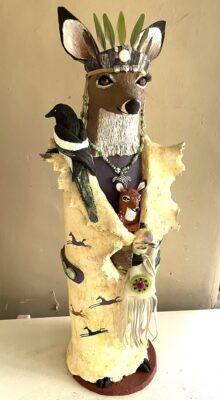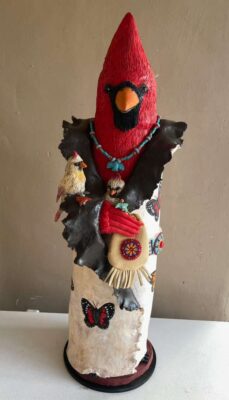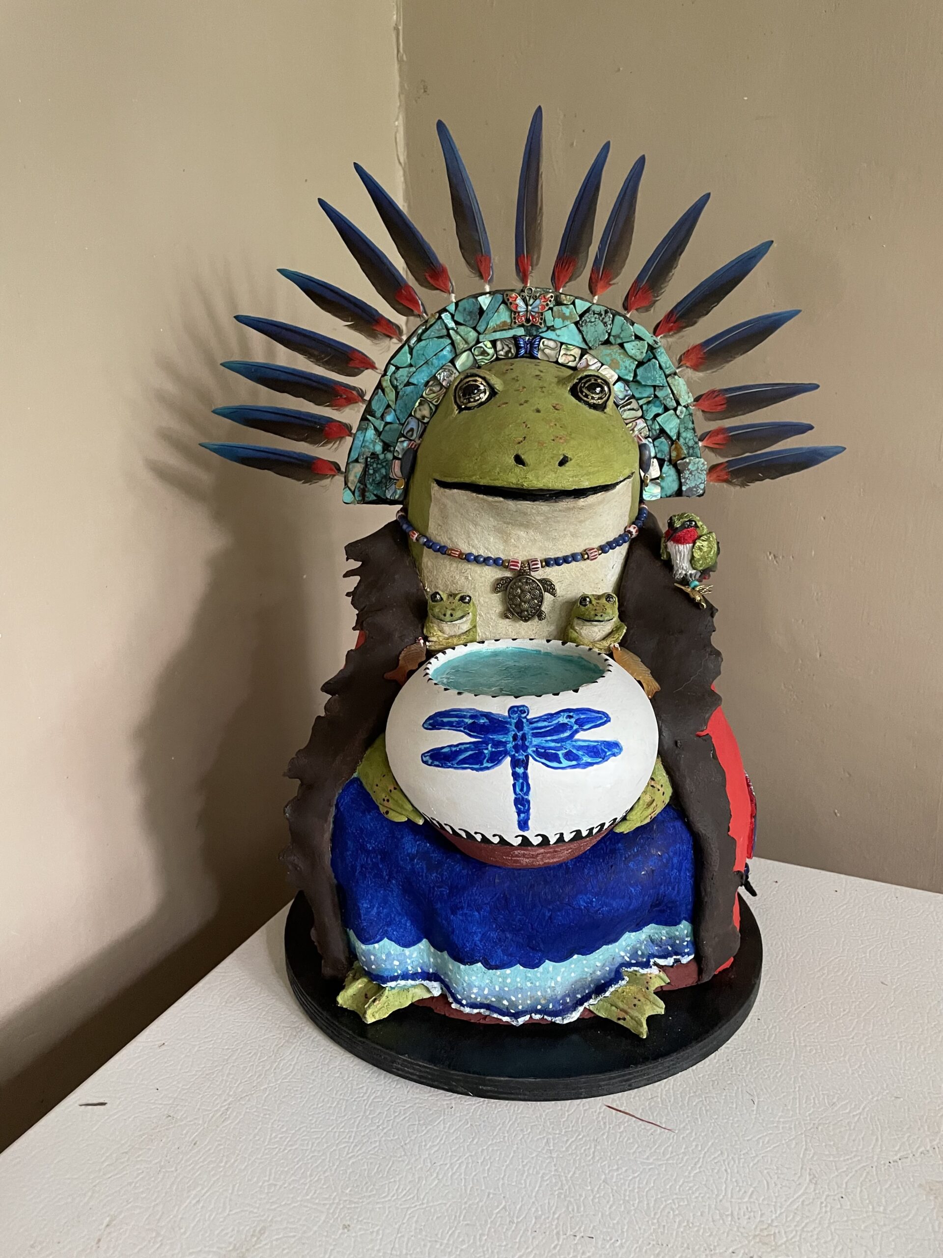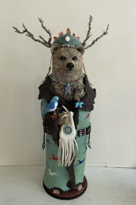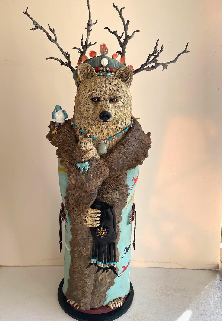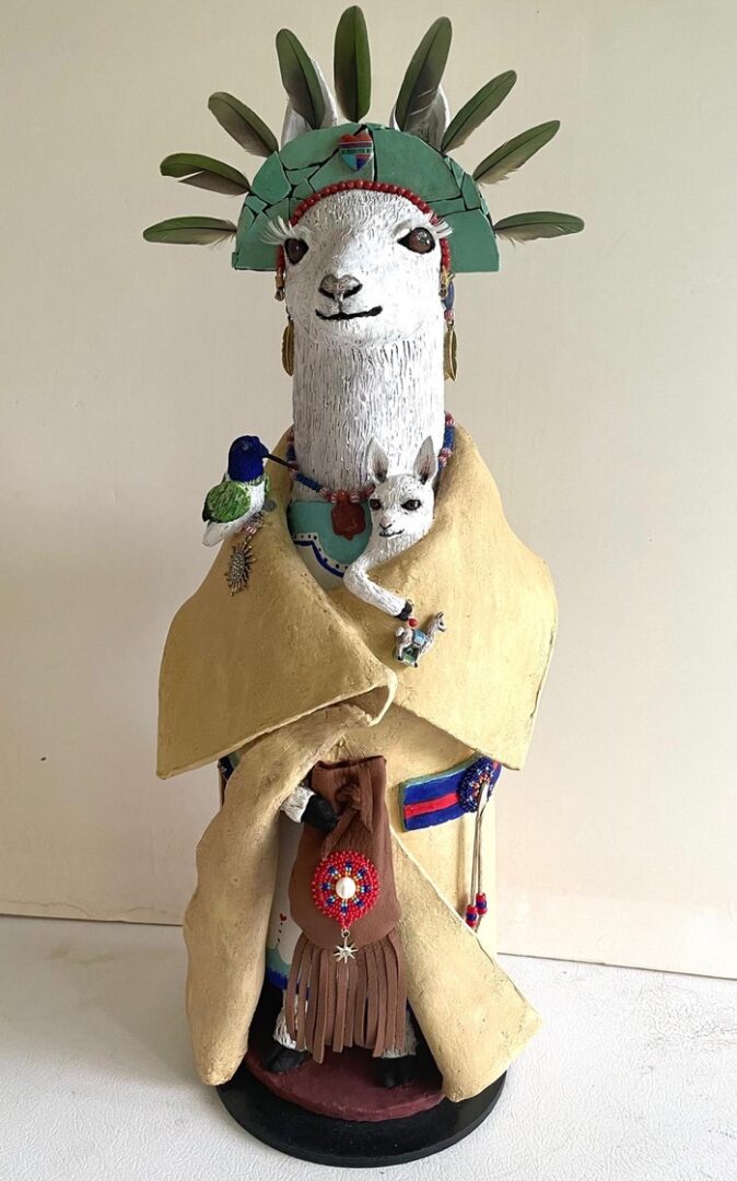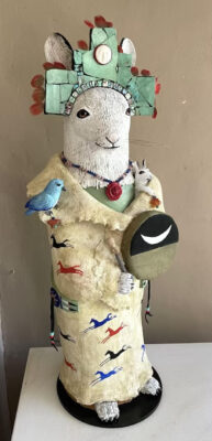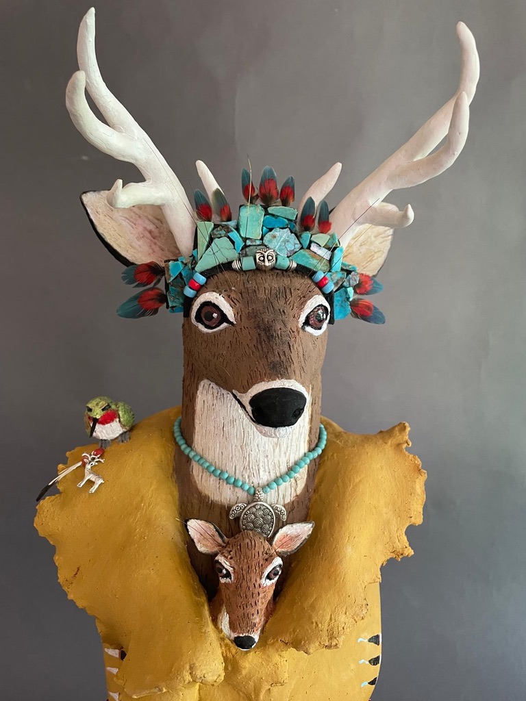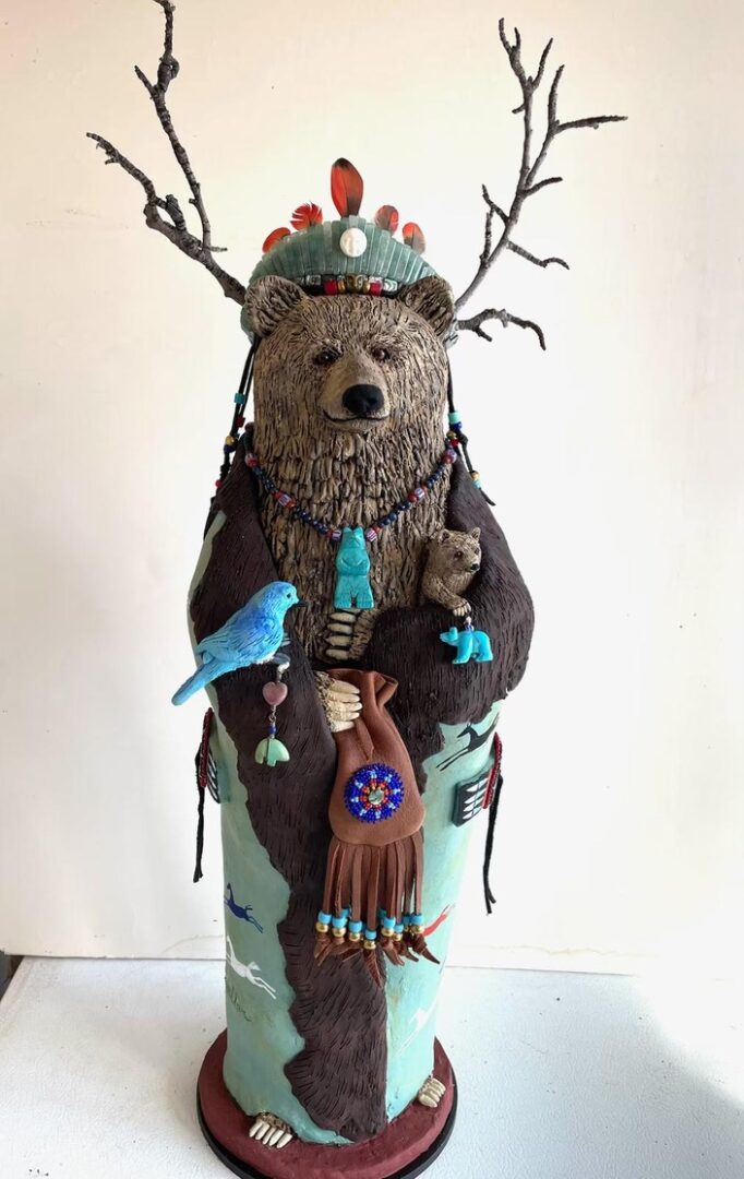 Each sculpture, inspired by dreams and folklore, is created in clay, fired, and then painted with oil paints. Each sculpture is also uniquely embellished with bead work, gemstones, and feathers from her macaws. Lostetter’s distinctive style of mythic animal sculpture is influenced by folk tales from ancient cultures and her respect for wild animals, their spiritual integrity, and their value to our world. Each of her sculptures carries a theme of nurturing; loving care for the young and for all life on this planet weaves through each detail of her sculptures.