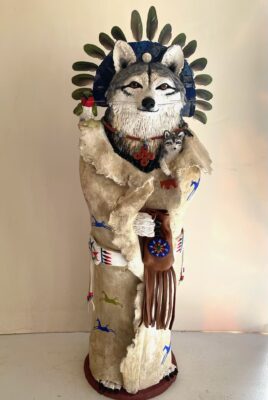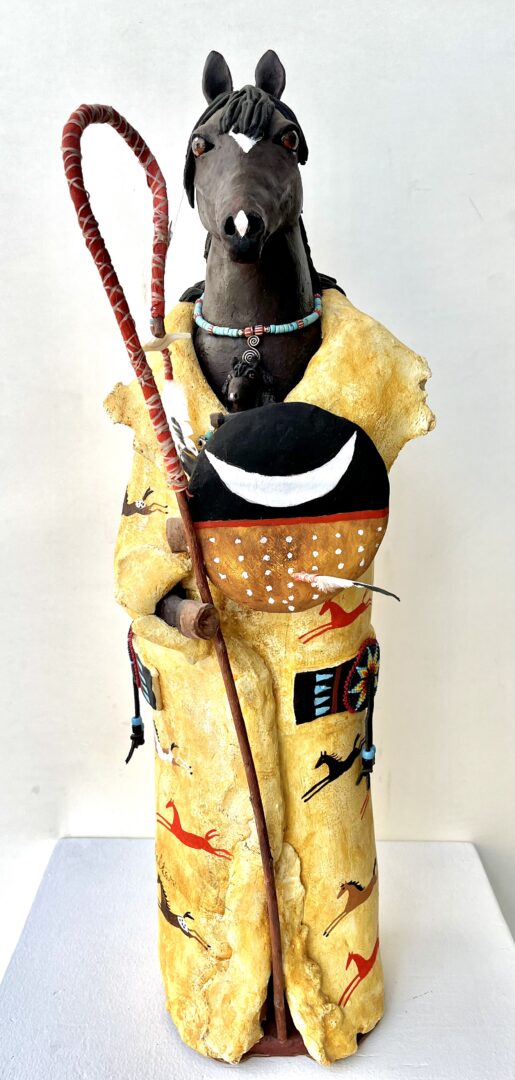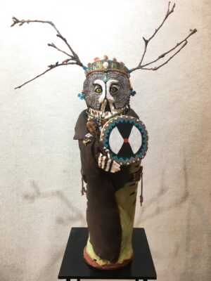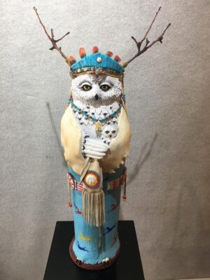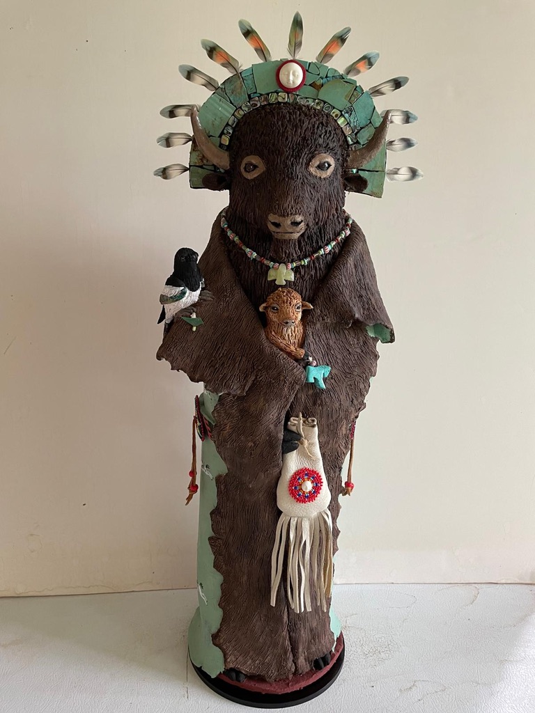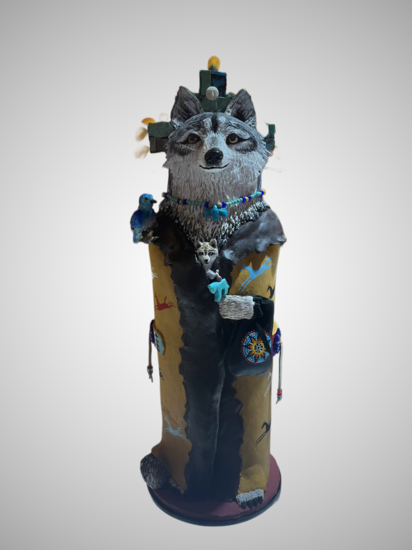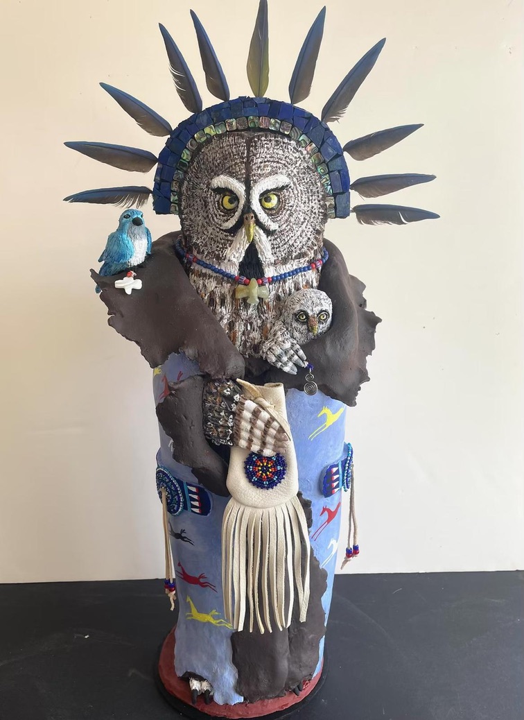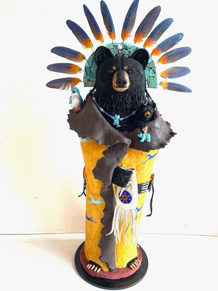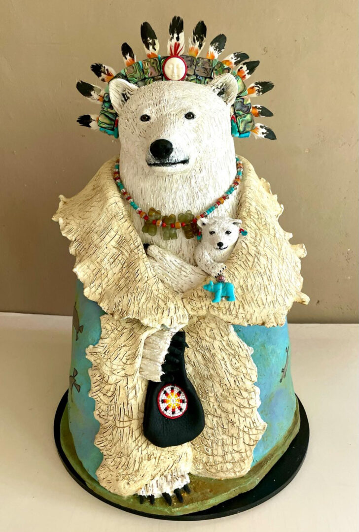 Each sculpture, inspired by dreams and folklore, is created in clay, fired, and then painted with oil paints. Each sculpture is also uniquely embellished with bead work, gemstones, and feathers from her macaws. Lostetter’s distinctive style of mythic animal sculpture is influenced by folk tales from ancient cultures and her respect for wild animals, their spiritual integrity, and their value to our world. Each of her sculptures carries a theme of nurturing; loving care for the young and for all life on this planet weaves through each detail of her sculptures.