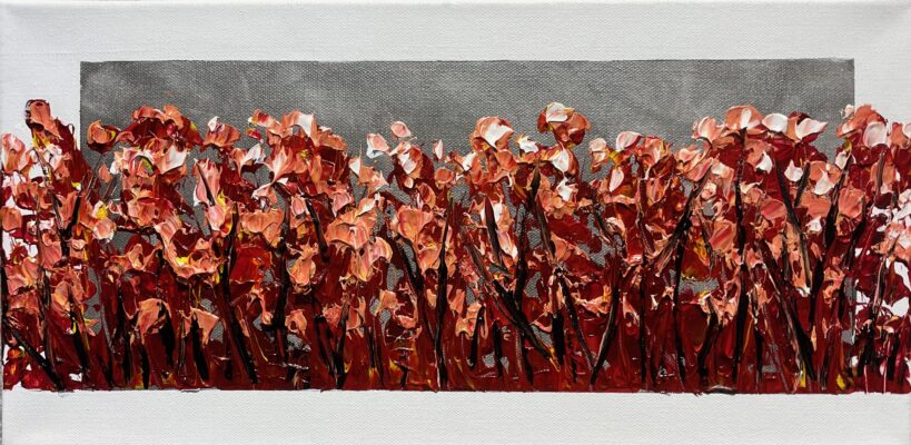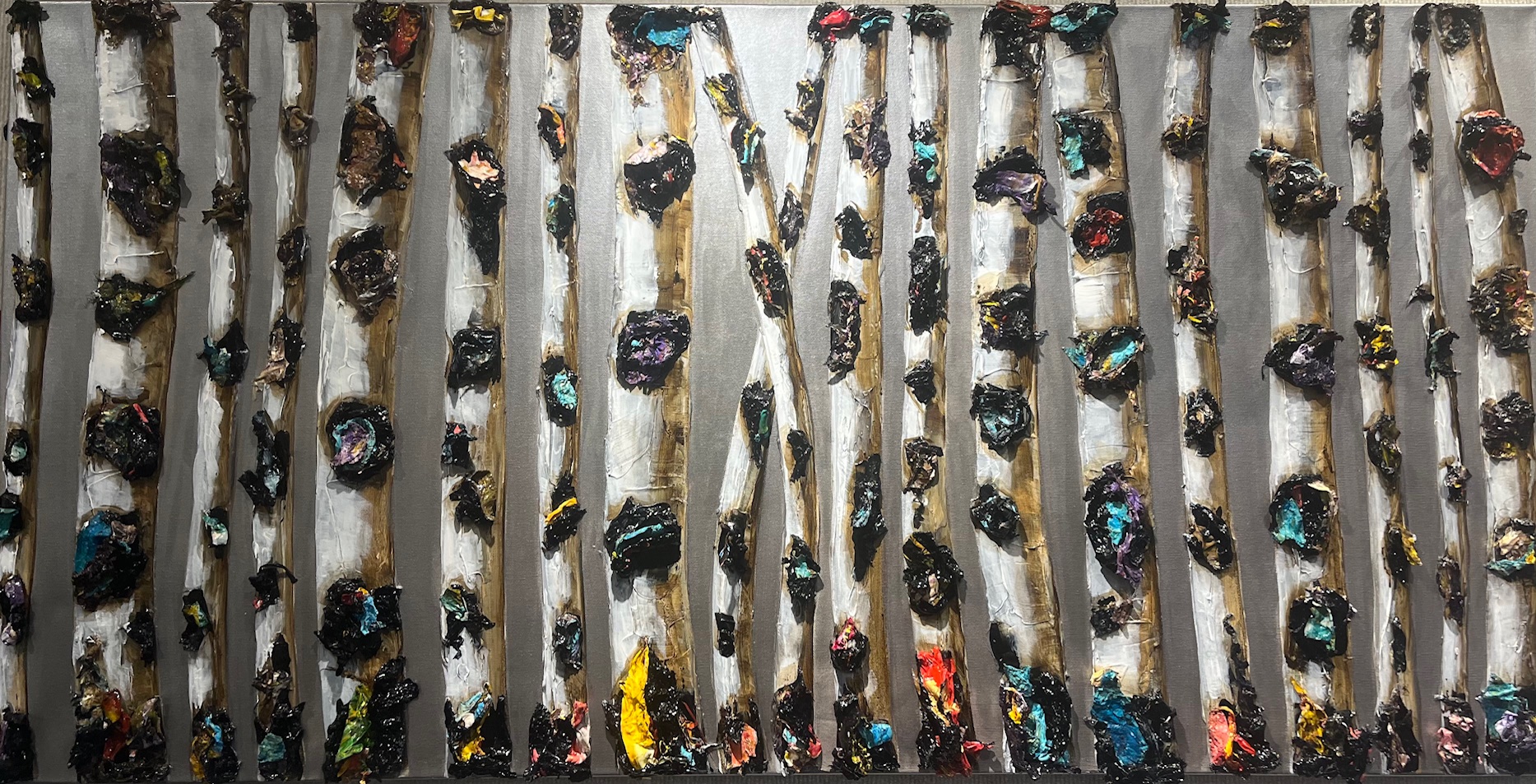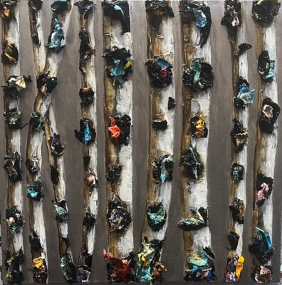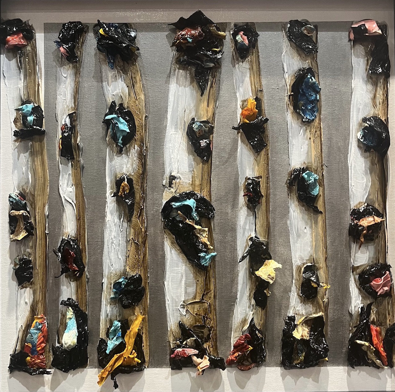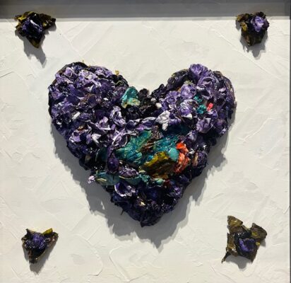 While Melda paints, her signature style goes far beyond the traditional brushstroke. She creates and incorporates acrylic “paint skins” into her pieces—scraping richly pigmented paint from her palette, then molding and shaping it by hand before attaching it to the canvas. These sculptural layers are carefully formed and placed, building a luminous, tactile surface that quite literally rises from the painting. The result is a dynamic interplay of color, depth, and light, set against shimmering complementary backgrounds that enhance the vitality of each work.