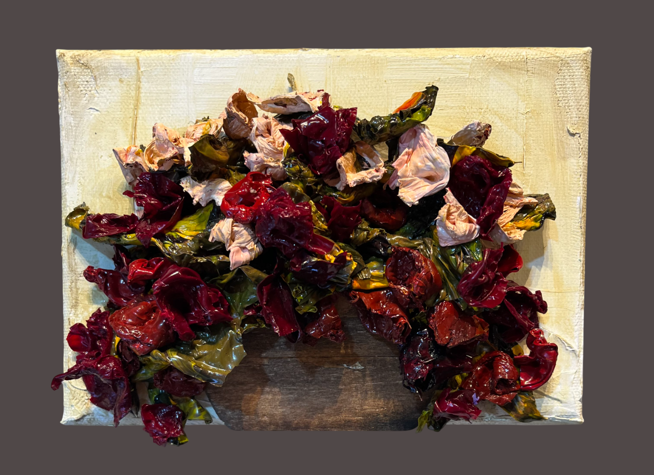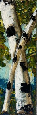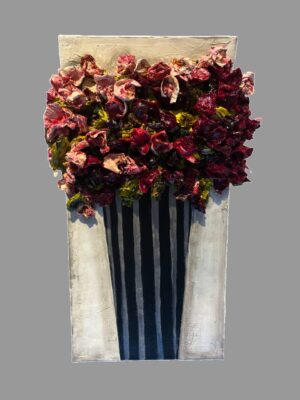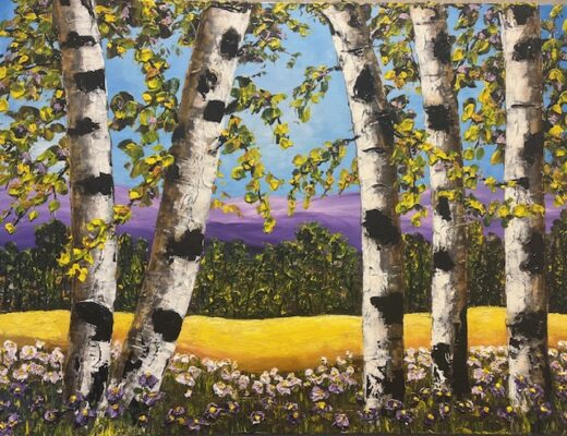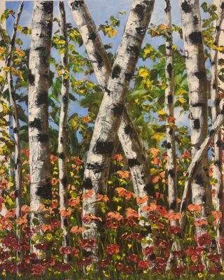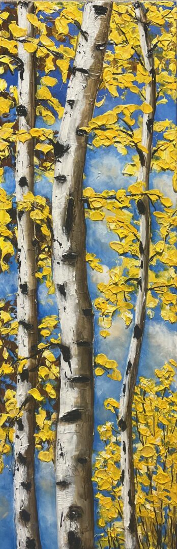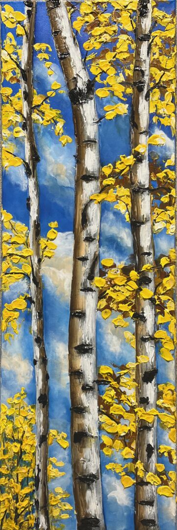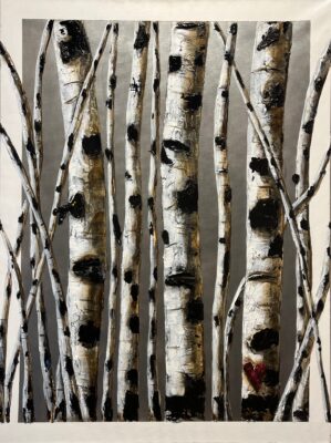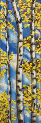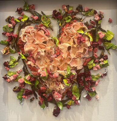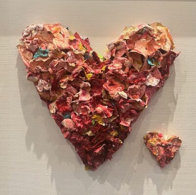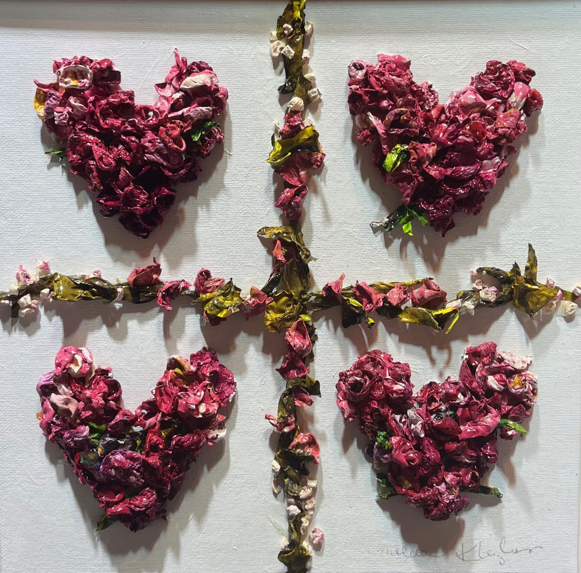 While Melda paints, her signature style goes far beyond the traditional brushstroke. She creates and incorporates acrylic “paint skins” into her pieces—scraping richly pigmented paint from her palette, then molding and shaping it by hand before attaching it to the canvas. These sculptural layers are carefully formed and placed, building a luminous, tactile surface that quite literally rises from the painting. The result is a dynamic interplay of color, depth, and light, set against shimmering complementary backgrounds that enhance the vitality of each work.