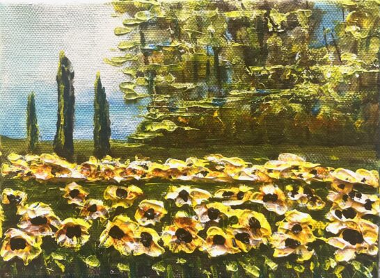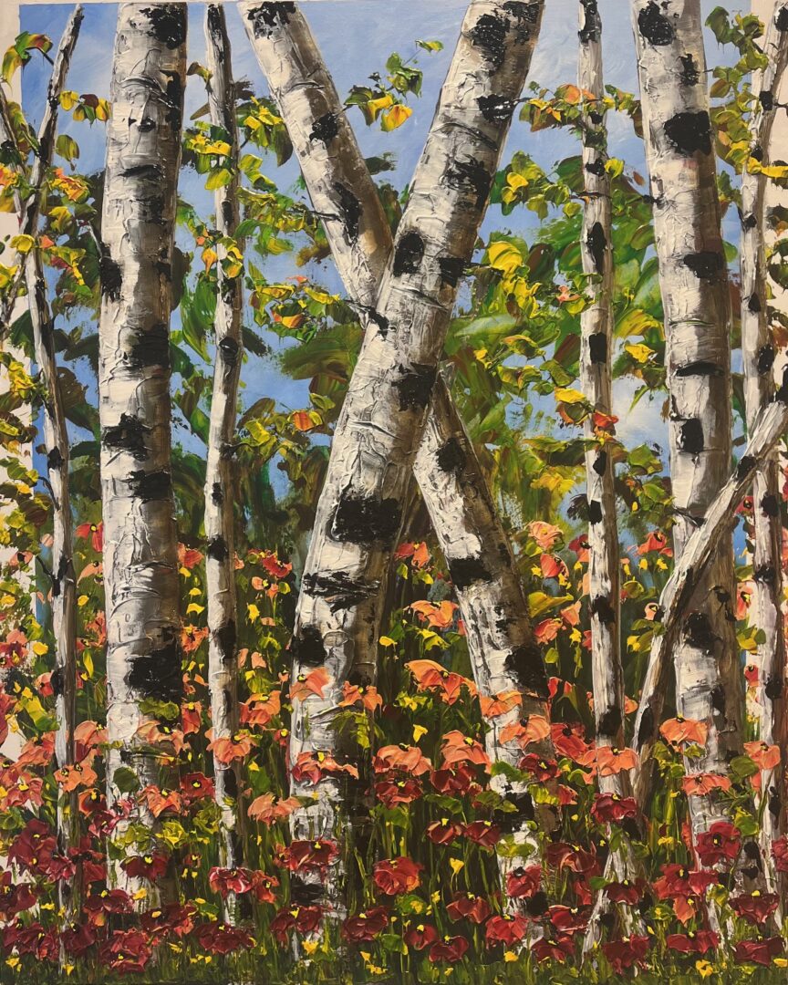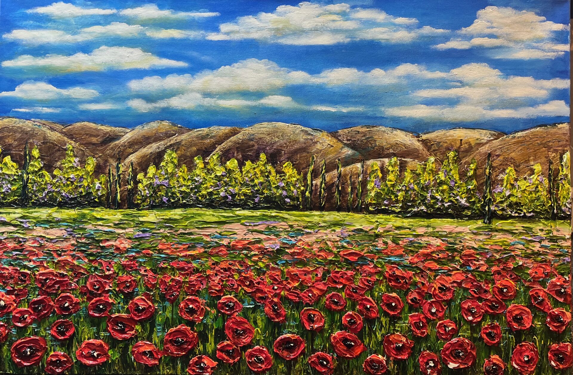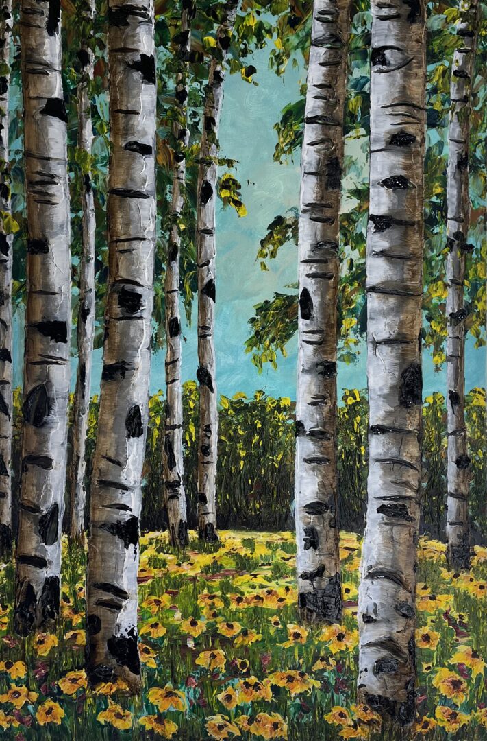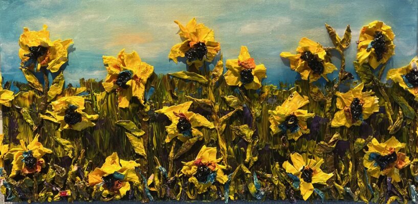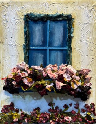 For Melda, painting is more than an art form—it is meditation, therapy, and joy. It relieves stress, restores balance, and allows her to see and celebrate life through color and form. She readily admits she tends to “go overboard” with her dimensional elements—once she begins adding layers of sculpted acrylic, she can’t stop. The more she builds, the more luminous and alive each piece becomes. To her, every added layer increases the richness, the energy, the “juice.”